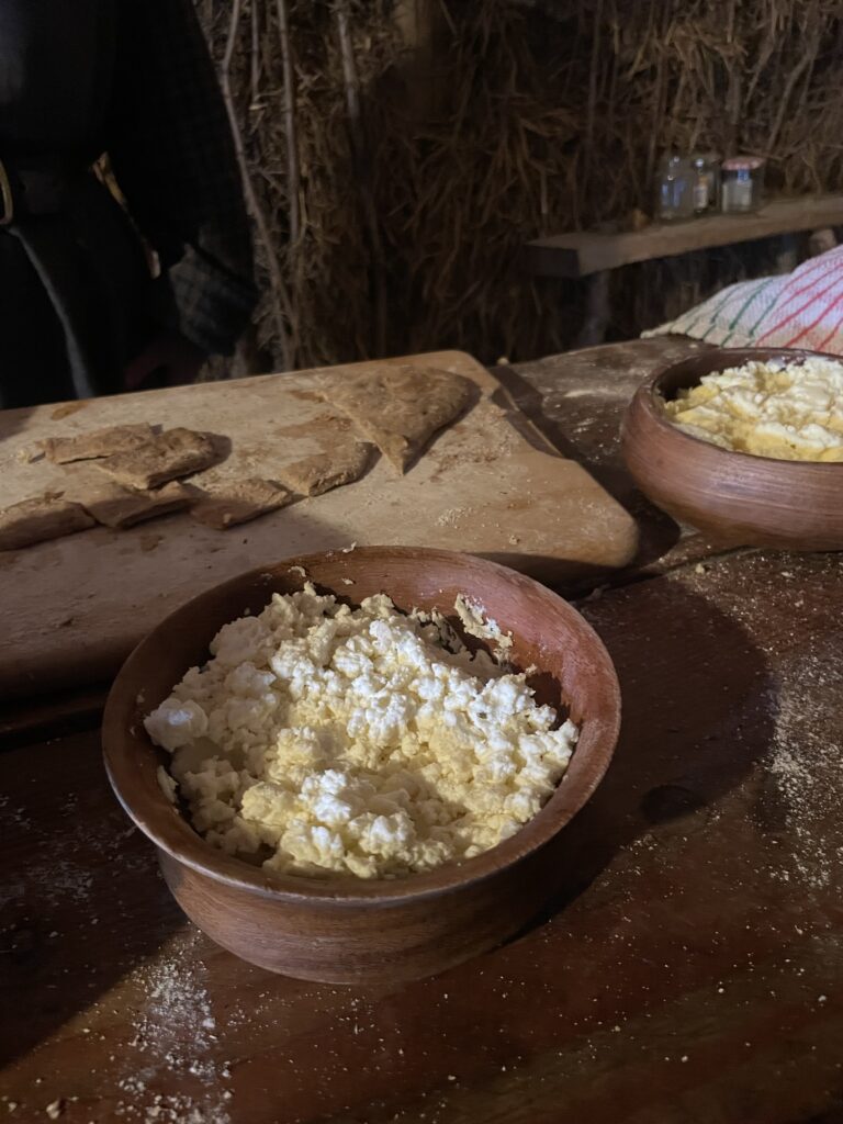 The final house revealed food preparation. I was thrilled to watch as spelt bread was made and baked on the fire. Even better was sampling it with butter, cheese, (the sort that I’d written about) and apple stew – all delicious.