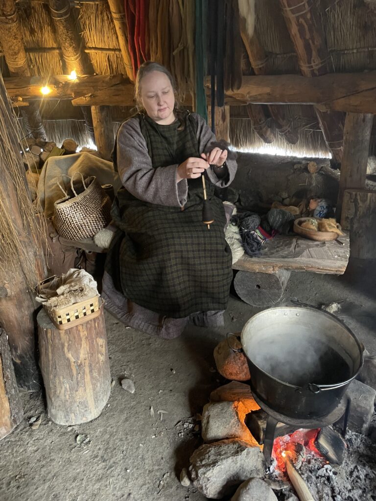 The satisfying end to the puppet show led us to chatting with the weaving archaeologist. I didn’t realise that the underclothes were linen which has anti-bacterial properties, so can take sweat and other body odours without the clothing becoming smelly. The linen was all that would have been washed. The woollen over-garments repelled water and if they got muddy they would be dried and then brushed clean.